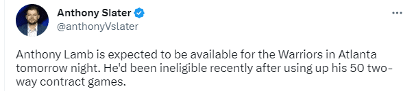 此前由于未转正且打满50场比赛,兰姆连续缺席了5场比赛,如今勇士最终决定把兰姆的合同转正,后者获得征战季后赛的资格。