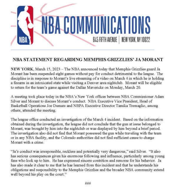 对于莫兰特事件,NBA总裁亚当-萧华表示:莫兰特的所作所为是不负责任、鲁莽且危险的,考虑到他有数量庞大的球迷以及巨大的影响力,尤其是在尊重他的年轻球迷中,这会产生严重的后果。莫兰特也对自己做出了真诚的悔悟和自责,并且莫兰特向我明确表示,他已经从这件事情中吸取到教训,他也明白自己对灰熊队和NBA社区的义务和责任,要远超于自己在球场上的表现。