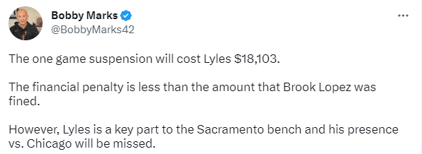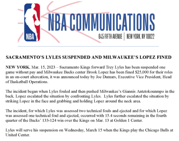 最终莱尔斯被联盟禁赛一场,损失18103美元,大洛佩兹因冲突被罚款2.5万美元。