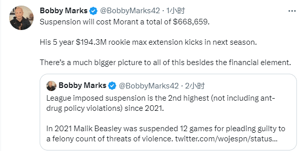 莫兰特因对联盟不利的行为被禁赛8场比赛,此前已停赛5场比赛,还剩3场停赛处罚,最早将在3月21日复出,名记表示莫兰特在接受咨询期间没有进行篮球训练,预计他的复出将会延后;薪金专家Bobby Marks表示,莫兰特被禁赛8场比赛,累计损失668659美元的薪水,他的5年1.943亿美元的合同在下赛季才生效。