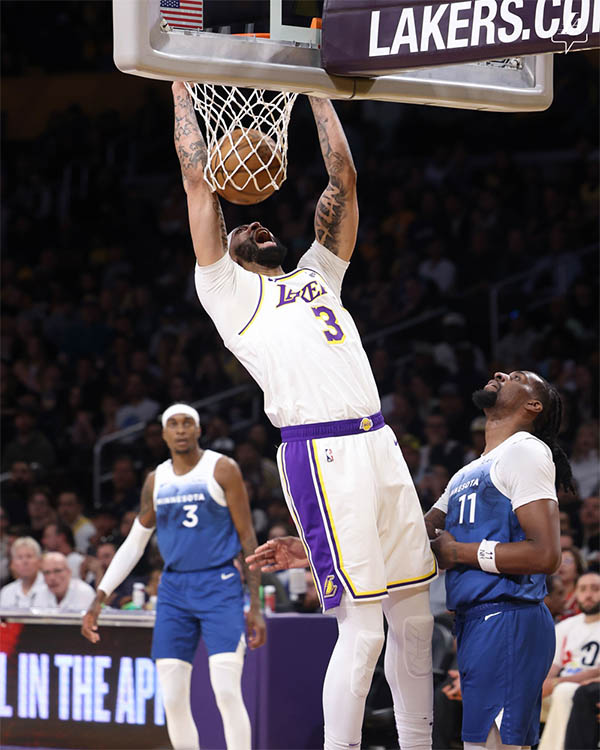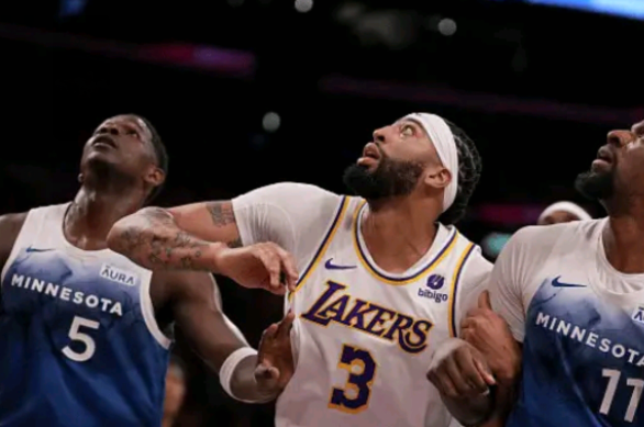 下半场,詹姆斯第三节发力,连得11分带队拉开分差,浓眉则是保护篮板以及抢断,可湖人领先13分后被森林狼打出20-3的反扑高潮,期间浓眉上篮惨遭爱德华兹摁帽,被帽翻倒地;被反超4分后普林斯2分止血,浓眉强硬得分,加尔扎压哨上篮,三节打完湖人落后1分。