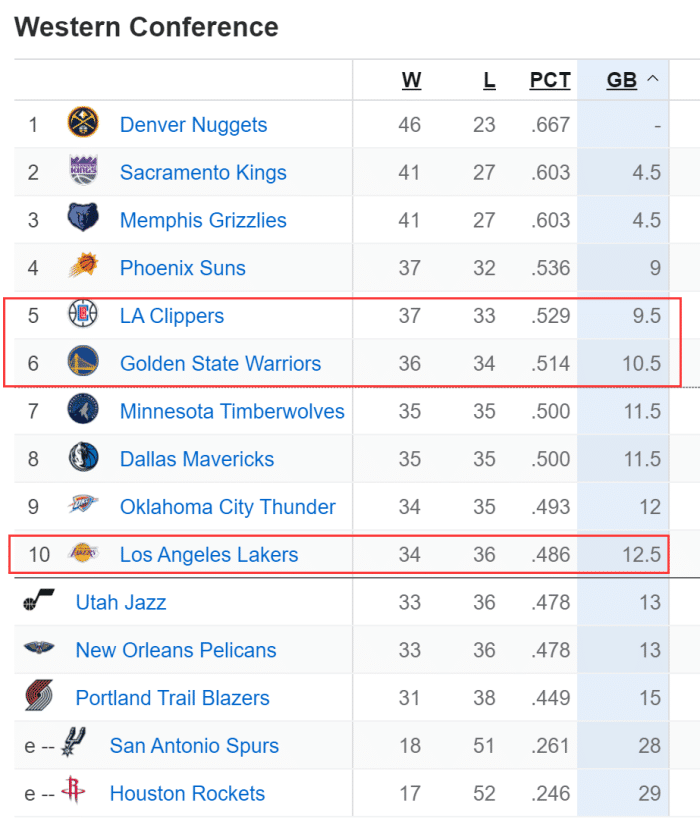 季后赛区西部第1-6依次为:掘金46胜23负,国王41胜27负、灰熊41胜27负、太阳37胜32负,快船37胜33负西部第五,勇士36胜34负西部第六。