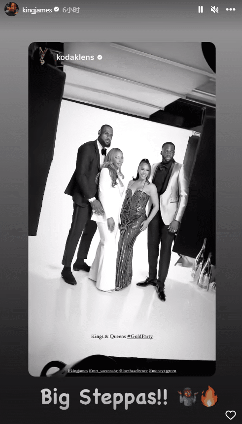 詹姆斯夫妇和格林夫妇都是身穿西装参加奥斯卡派对并且拍摄合影,合影时萨瓦娜的礼服外面套着一件白色外套,海泽尔(追梦老婆)则十分性感,吐舌动作逗笑詹嫂,然后38岁的詹姆斯也搞怪吐舌;詹姆斯还转发他们四人合影的画面。