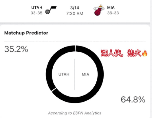 当然明天湖人还有重返西部前十的机会,爵士大战热火,一旦爵士输球,那么湖人的排名会重返西部第十名,雷霆第九名,这对于湖人的球迷们来说自然是希望看到的,ESPN给出明日热火获胜概率64.8%,也就是说爵士输球的可能性还是很大的。