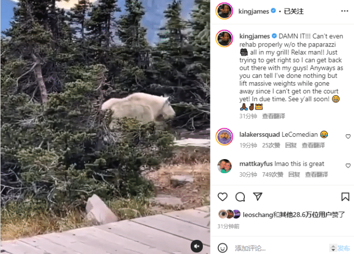 詹姆斯晒出一只野生山羊接近他的住所的视频,配文写道:damn IT!甚至都不能在没有狗仔队偷拍我的烧烤的情况下进行恰当的复健!放轻松,哥们!我只想恢复正常,这样我就能回到场上和我的队友们一起打球了!无论如何,正如你们知道的那样,我在离开期间除了大量举重什么也没做,因为我还不能到场上练球!我很快就会跟大家见面的。