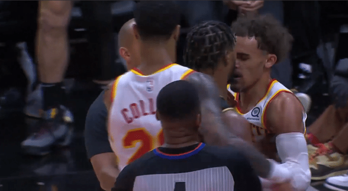 第四节比赛还剩1分25秒,特雷-杨突破上篮时他的脚抬起踢到了斯玛特的裆部,对此斯玛特非常不满并上前与其理论,两人互喷纠缠在一起,两人甚至直接抱摔倒地,众人迅速围了上来;两人起身后,斯玛特和特雷-杨仍旧互喷。