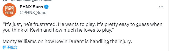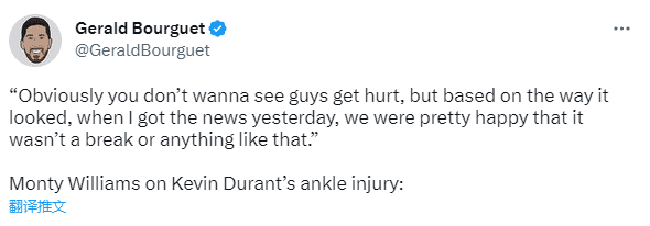 对于杜兰特的伤情,太阳主帅蒙蒂-威廉姆斯表示:杜兰特很沮丧,他想打比赛。当你想到凯文时,很容易猜到他有多喜欢打球。显然你不希望看到有人受伤,但从昨天的情况来看,当我得到消息时,我们很高兴他没有遭遇骨折或类似的事情。”