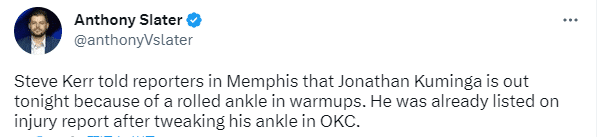 今天勇士对阵灰熊赛前,勇士新星库明加也崴脚受伤,确定缺席比赛,对此美媒Talkin NBA调侃联盟应该取消热身。