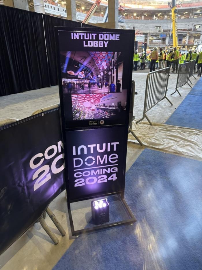 在快船新球馆中,有广告牌预告这座球馆将会在2024年投入使用,Intuit Dome球馆位于洛杉矶市区西南方向的英格尔伍德,现场容纳18000名球迷,这是一座超级豪华的现代化球馆。
