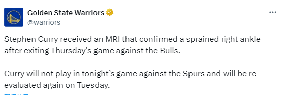 勇士官方公布库里伤情——在对阵芝加哥公牛的比赛中,库里遭遇右脚踝受伤,昨天他接受了核磁共振检查,检查结果显示为踝关节扭伤,没有遭遇结构性损伤,他将不会参加今日对阵马刺的比赛,并将在下周三再次接受评估。