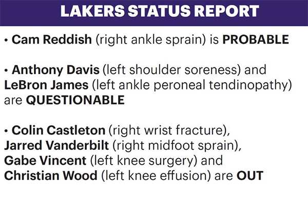 湖人官方公布最新伤情——雷迪什(右脚踝扭伤)大概率出战;詹姆斯(左脚踝腓侧肌腱)和浓眉(左肩酸痛)出战成疑;卡斯尔顿(右手腕骨折)、范德彪、右脚扭伤)、文森特(左膝手术)和伍德(左膝积液)被列为缺席。