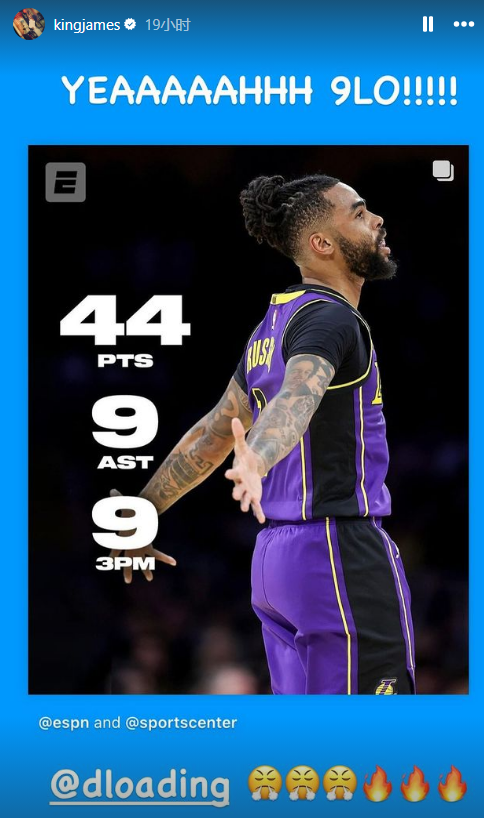 詹姆斯因伤休战,拉塞尔独中9记三分且轰下44分9助攻6篮板,末节21分绝杀雄鹿;赛后詹姆斯尖叫着兴奋庆祝,与拉塞尔击掌,并且在社媒上夸赞拉塞尔。