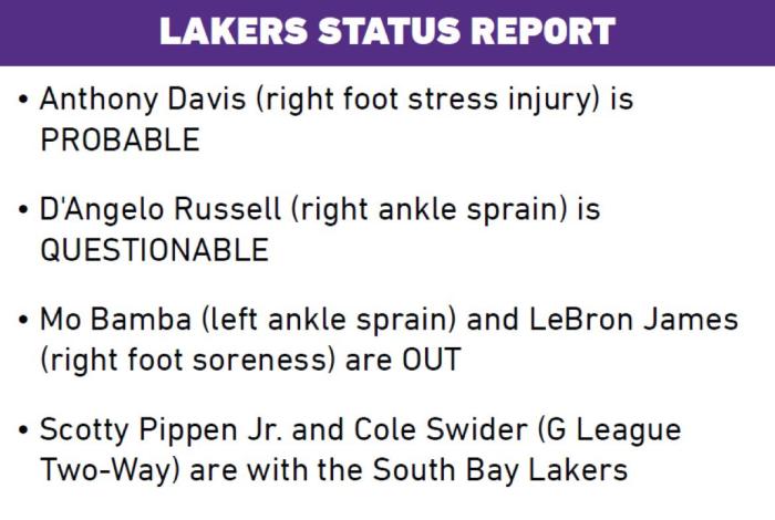 来源:JRS直播网03-07 10:12JRS直播网讯03月07日,湖人官方公布下一场对阵灰熊的伤病报告,浓眉(右脚应激伤病)大概率出战,拉塞尔(右脚踝扭伤)出战成疑,詹姆斯(右脚肌腱受伤)和班巴(左脚踝扭伤)因伤休战,皮蓬和斯威德仍在发展联盟;湖人至少4人缺战灰熊,仍旧没有詹姆斯的具体复出时间,拉塞尔伤势仍未痊愈。