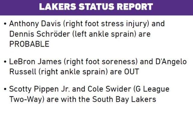 湖人官宣5人缺战勇士:詹姆斯拉塞尔继续缺阵 浓眉大概率上场