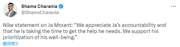 来源:JRS直播网03-05 16:20JRS直播网讯03月05日,灰熊球星贾-莫兰特夜店持枪事件引热议,NBA联盟介入调查,灰熊官方宣布莫兰特离开球队,至少缺席接下来的两场比赛;莫兰特已经公开道歉,之后耐克对此事发表官方声明:我们(耐克)感谢贾-莫兰特的责任心,他需要花费一些时间来寻求帮助。我们支持他优先考虑如何把自己的问题解决好。