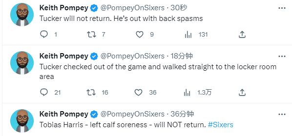 76人连伤两大主力:哈里斯和塔克提前伤退 恩比德带伤坚持一度离场