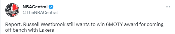 据Haynes报道,威少本赛季在湖人效力的52场比赛里,有49场比赛出任替补,这让他有资格去竞争本赛季的最佳第六人奖项。即使他接下来将在快船打首发,但我今早和他通话时,他表示那是他想要得到的荣誉。他说他做了很多去融入湖人的体系,在那里打得很不错。