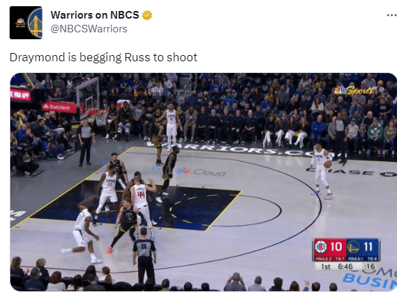 上一场快船不敌勇士,威少多次被勇士放空,面前5米没人仍不敢投,尤其是第一节,威少被格林放空5米一幕,如此一幕又把威少的缺陷无限放大;美媒纷纷转发,NBCS调侃德拉蒙德乞求威少投篮,赛后格林表示他就是为了搞威少的心态;本场比赛,威少首发上场28分钟,12投3中、三分5中0仅仅拿到8分6助攻。