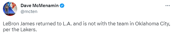 来源:JRS直播网03-02 10:12JRS直播网讯03月02日,詹姆斯、浓眉和拉塞尔三大主力都因伤缺战雷霆,据报道,詹姆斯已经提前返回洛杉矶,暂时离开球队,未随队前往俄城。