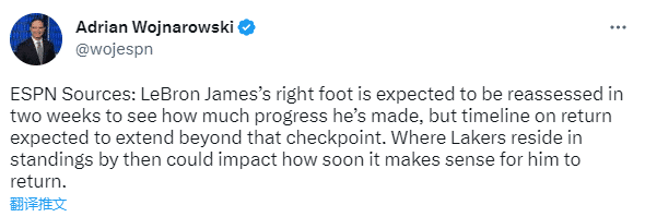 名记Woj则报道,湖人球星詹姆斯的伤势将在两周后接受评估,他的复出时间预计会晚于这个时间点。此外,湖人届时在积分榜上的位置也会影响詹姆斯的复出时间。另一名记Haynes则表示,詹姆斯接受评估时对球队前进方向的理解将决定他是否会休战更长的时间。