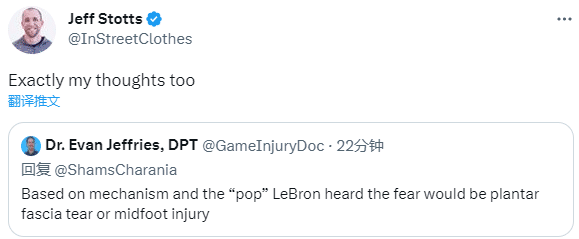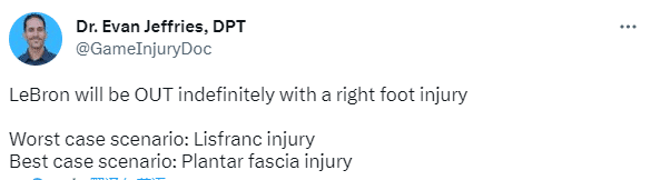 医学专家Evan Jeffries分析詹姆斯的伤势;,最坏情况是跖跗关节损伤,最好结果是足底筋膜损伤专家猜测詹姆斯可能遭遇中足受伤或者足底筋膜撕裂,Jeff Stotts也是这样认为。
