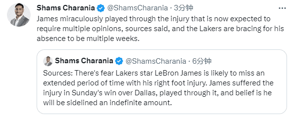 据名记Shams报道,詹姆斯可能因为右脚伤势缺席较长一段时间,詹姆斯的伤势预计需要多方面的诊断意见,湖人正在为他缺席数周的时间做准备。