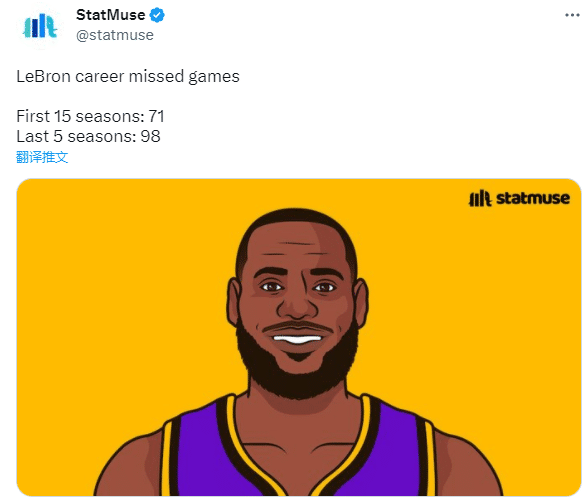 美媒StatMuse发推写道:詹姆斯在生涯的前15个赛季中仅缺阵了71场比赛,而近5个赛季已经缺席了98场。