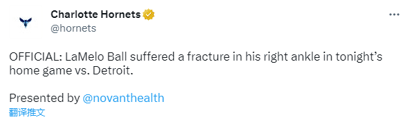 黄蜂官宣三球右踝骨折:预计至少伤停4个月 因伤提前赛季报销