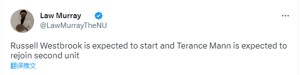 来源:JRS直播网02-25 12:18JRS直播网讯02月25日,据快船随队记者Law Murray报道,球队新援威少预计将首发出战,特伦斯-曼恩预计将回到第二阵容;名记揭秘快船签约威少内幕,乔治力排众议获小卡支持。