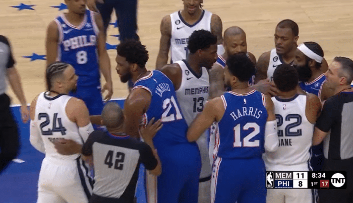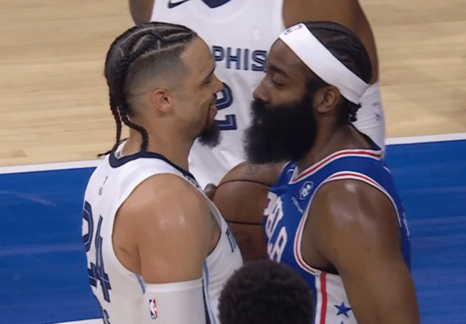 灰熊悍将摸哈登臀部险引冲突:两人口角互喷 恩比德第一时间冲过去