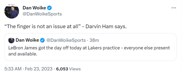 目前湖人27胜32负,排名西部第13位,周五上午11点,他们将在主场迎战勇士。詹姆斯此前表示自己会力争出战余下所有比赛,从哈姆的采访可以看出,他的手指伤病无碍,应该不会影响他出战比赛。
