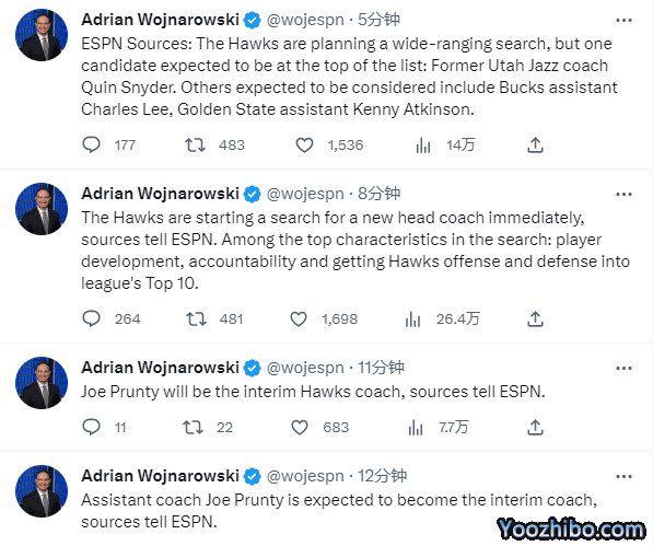 来源:JRS直播网02-22 10:52JRS直播网02月22日讯 ,篮网和主教练沃恩续约多年,但老鹰主帅正式下课,据名记woj报道,老鹰已经解雇主帅麦克米兰,球队助教乔-普朗蒂预计将成为球队代理主帅;新帅潜在候选人有前爵士主帅斯奈德(头号候选人)、雄鹿助理查尔斯李,勇士助理肯尼-阿特金森。