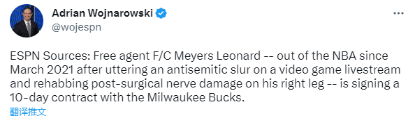 来源:JRS直播网02-21 10:47JRS直播网02月2日讯 ,据ESPN名记Woj报道,自由球员迈耶斯-伦纳德计划和雄鹿签下一份10天合同,2012年首轮11号秀时隔2年多重返NBA。
