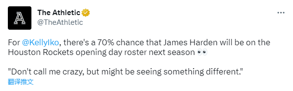 火箭队记者Kelly Iko在个人专栏上表示,在他看来,哈登在下赛季开始时有70%的可能回到火箭,直言:无风不起浪,别说我疯了,我可能只是看到了一些不一样的东西。