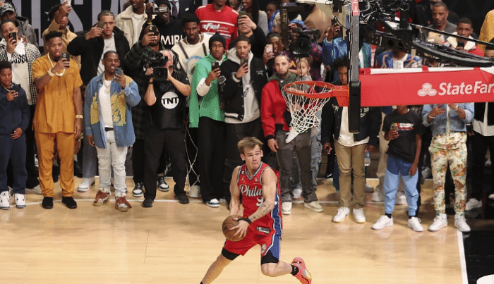 如今的麦克朗被费城76人用双向合同签下,此前麦克朗效力于76人发展联盟附属球队,场均上场25.9分钟,得到19.1分2.7篮板4.7助攻0.8抢断。所以这次参加NBA全明星的星锐赛和扣篮大赛,麦克朗是以76人球员的身份参加的,穿着费城战袍。