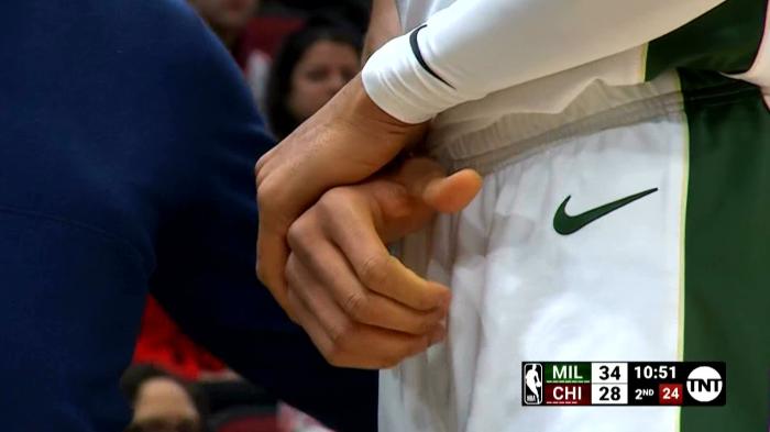 第二节10分55秒,怀特持球突破,字母哥在防守时和怀特双双倒地,字母哥倒地时手部撞到篮球架,倒地后抱着手十分痛苦,换了一会站起来,然后镜头给到字母哥的手,紧接着字母受伤离场返回更衣室接受检查。