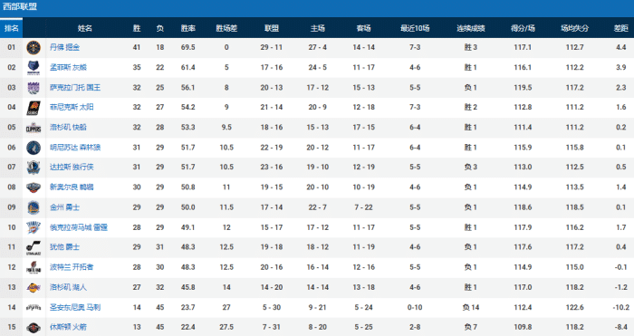 来源:JRS直播网02-16 21:10JRS直播网讯02月16日NBA常规赛继续进行,西部的掘金击败独行侠,迎来3连胜,稳居西部第一。灰熊击败爵士、暂居西部第二。马刺不敌黄蜂,湖人大胜鹈鹕避免连败,接下来我们一起来看看西部最新排名: