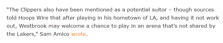 快船想要引援威少,可名记报道威少可能不向加盟快船,因为后者和湖人共用一个主场;换言之,若威少和爵士达成买断并且加盟快船重返洛杉矶,威少又回到熟悉的加密球馆,这可能会让威少经常想起一些伤心事。