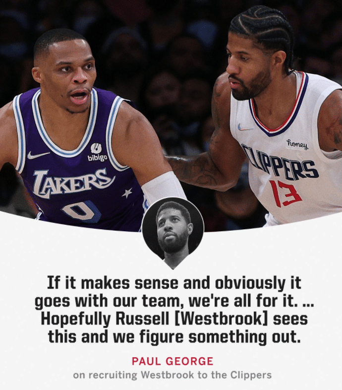 快船、公牛和热火都是威少的潜在下家,其中快船队十分想要威少,乔治、小莫里斯都公开招募威少,乔治表示威少能够帮助快船提升球队,还透露小卡也喜欢威少;小莫表示我们会张开双臂欢迎他。