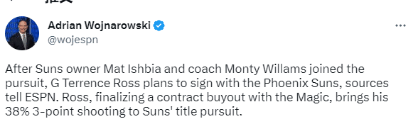 此前特伦斯-罗斯和魔术达成买断,48小时澄清期之后将成自由球员,独行侠、热火等多支球队有意罗斯,最终在太阳老板和主帅蒙蒂的招募下,罗斯计划签约太阳,助杜兰特、保罗和布克冲击总冠军。