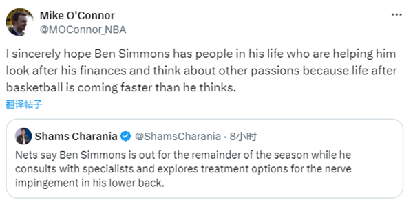 76人记者Mike O'Connor表示我真诚地希望在本-西蒙斯的生活中有人能帮助他管理财务并考虑其他爱好,因为他的篮球生涯结束后的生活比他想象的来得更快;该记者还表示西蒙斯天赋异禀,职业生涯变成这样是NBA的悲剧。