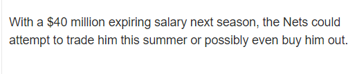 对于西蒙斯的情况,篮网跟队记者Brian Lewis表示篮网今夏可能交易他,甚至直接买断西蒙斯的合同,估计他的篮网生涯要结束了。