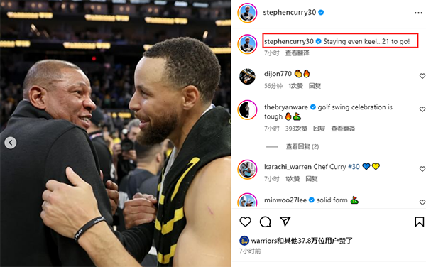 几个小时前,库里更新社媒,晒出大胜雄鹿的赛场照,其中有库里命中三分后模仿打高尔夫庆祝的动作,还有库里大笑搂着雄鹿主帅里弗斯的画面,并且配文写道:继续稳步前进,还有21场比赛。