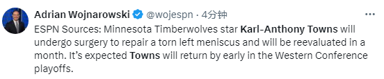 来源:JRS直播网03-08 11:36JRS直播网03月08日讯,据名记woj报道,森林狼球星唐斯将接受半月板修复手术,将在一个月后重新接受评估,预计季后赛初期回归。