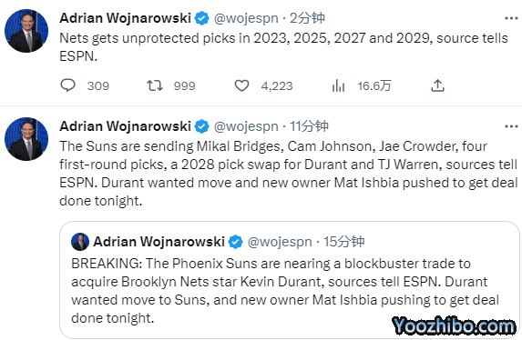 篮网送走杜兰特和TJ-沃伦,从太阳得到布里奇斯、卡梅隆-约翰逊、克劳德、四个首轮签和2028年的选秀权互换;据悉篮网得到的是2023年、2025年、2027年和2029年无保护首轮签。