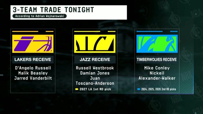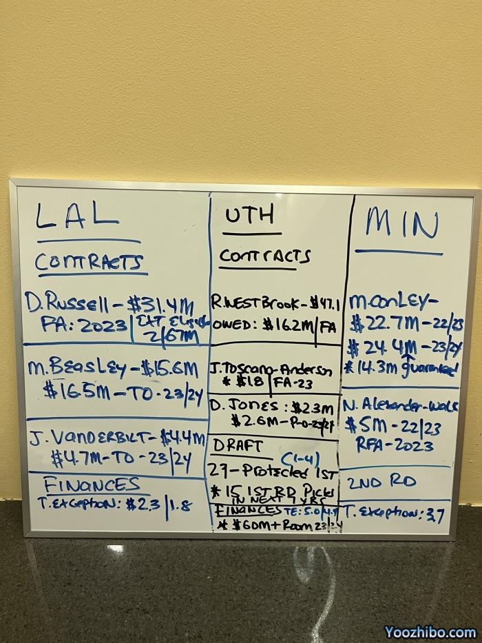 爵士得到威少、托斯卡诺-安德森、达米安-琼斯和一个来自湖人2027年受保护(1-4顺位)的首轮签;