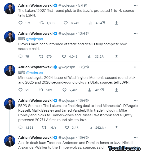 来源:JRS直播网02-09 10:21JRS直播网讯02月09日,湖人、爵士和森林狼三方涉及8名球员和5个选秀权重磅大交易达成,湖人4换3送走威少、安德森、琼斯和2027年首轮为詹姆斯引援三大帮手,威少加盟爵士,拉塞尔重返洛杉矶,康利被送到森林狼;威少或被买断并可能加盟快船,爵士未来7年拥有15个首轮签。