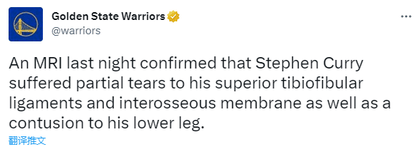 来源:JRS直播网02-06 18:19JRS直播网讯02月06日,勇士官方宣布,核磁共振检查结果显示,库里遭遇左胫腓上韧带和骨间膜部分撕裂的伤病,左小腿也有挫伤,名记shams报道预计库里缺席数周,将无缘全明星赛;医学专家表示预计伤停3-6周。