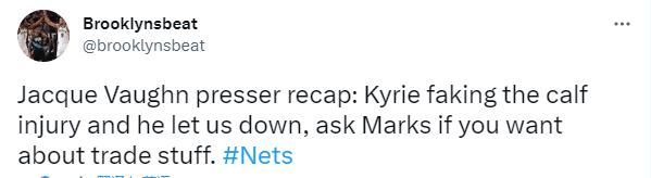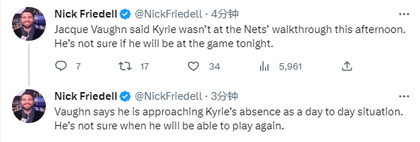是否对欧文缺席感到失望,沃恩表示:我认为作为一名篮球运动员,你有责任,就像我作为一名教练一样。我每天都会出现,我每天都在做我的工作,这就是我的职责。