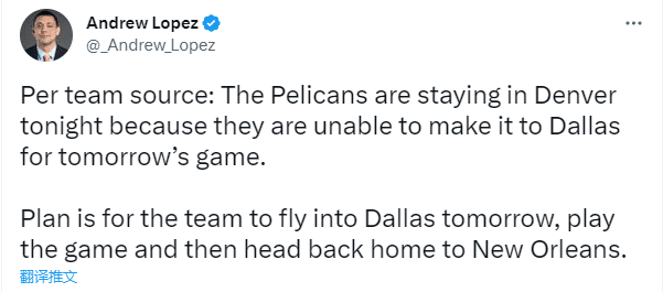 鹈鹕队的计划也受到恶劣天气的影响,据鹈鹕随队记者Andrew Lopez报道,由于受到达拉斯恶劣天气影响,导致很多航班被取消,鹈鹕今天无法前往达拉斯,球队将继续留在丹佛观察情况。